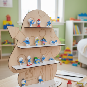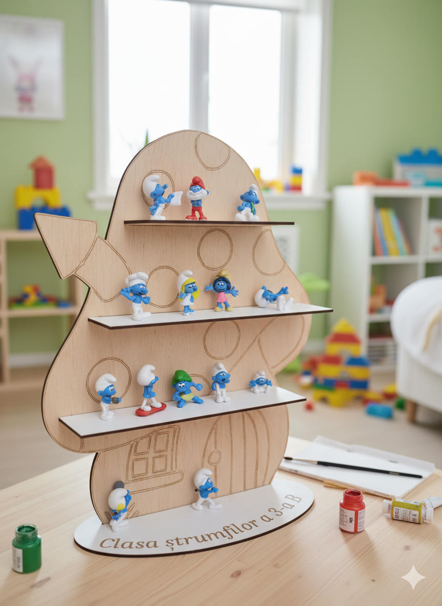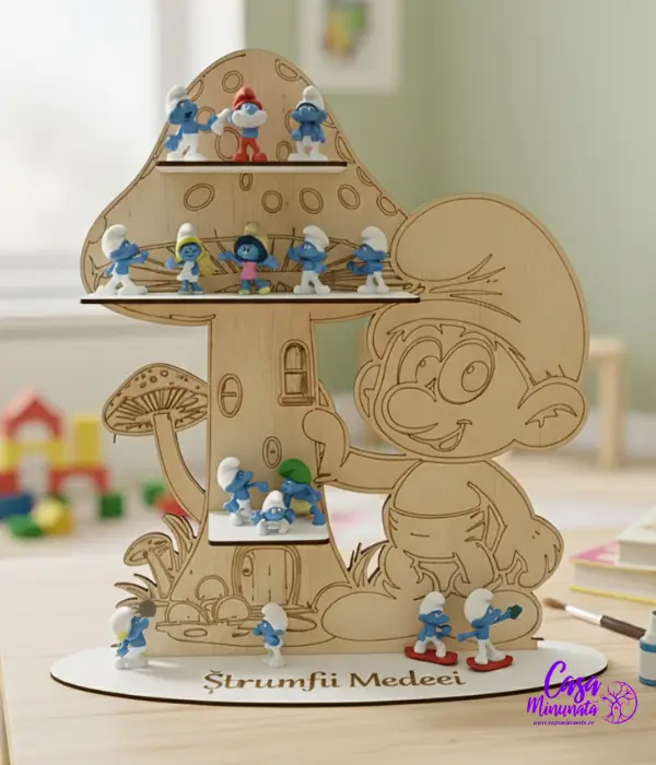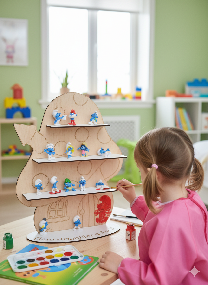 Transformă joaca într-o aventură creativă cu Casuta Strumfilor de colorat , un decor minunat din lemn natural, special gândit pentru micii artiști!