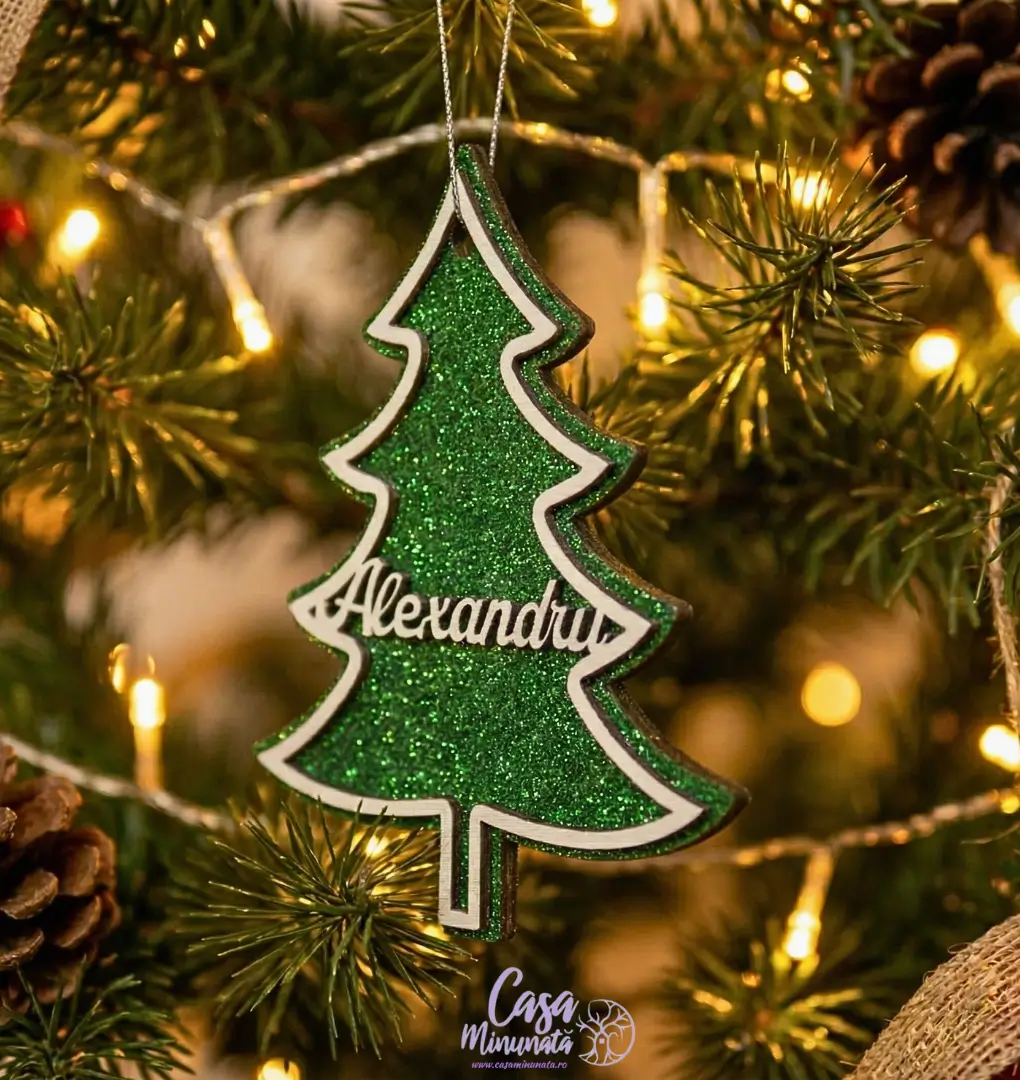 Realizat cu o atenție deosebită la detalii, ornamentul combină naturalețea lemnului cu strălucirea festivă a glitter-ului verde, având numele ales de tine decupat elegant în centru. Este cadoul ideal pentru prieteni, membri ai familiei, colegi sau chiar pentru primul Crăciun al unui bebeluș.