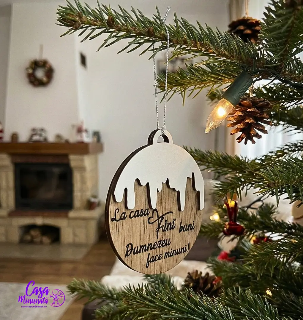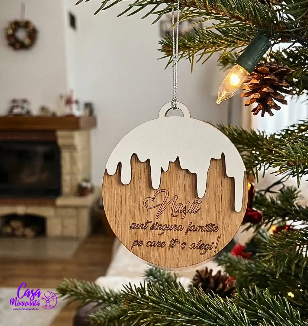 Realizat cu atenție la detalii, globul îmbină căldura lemnului natural cu un design modern de „zăpadă care se scurge” în partea superioară, oferind un contrast elegant care iese în evidență printre luminițele din brad.