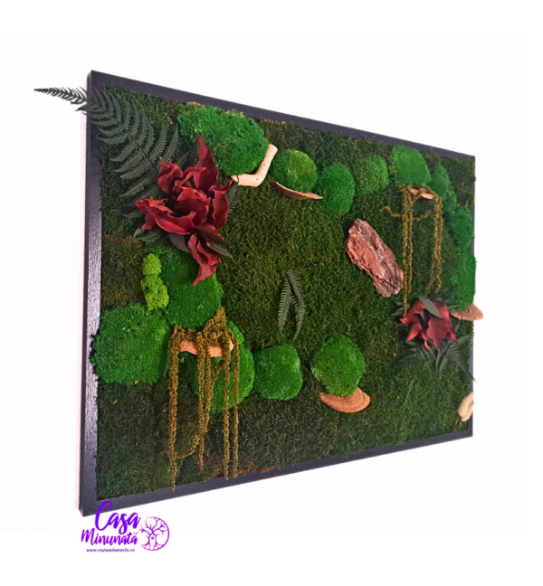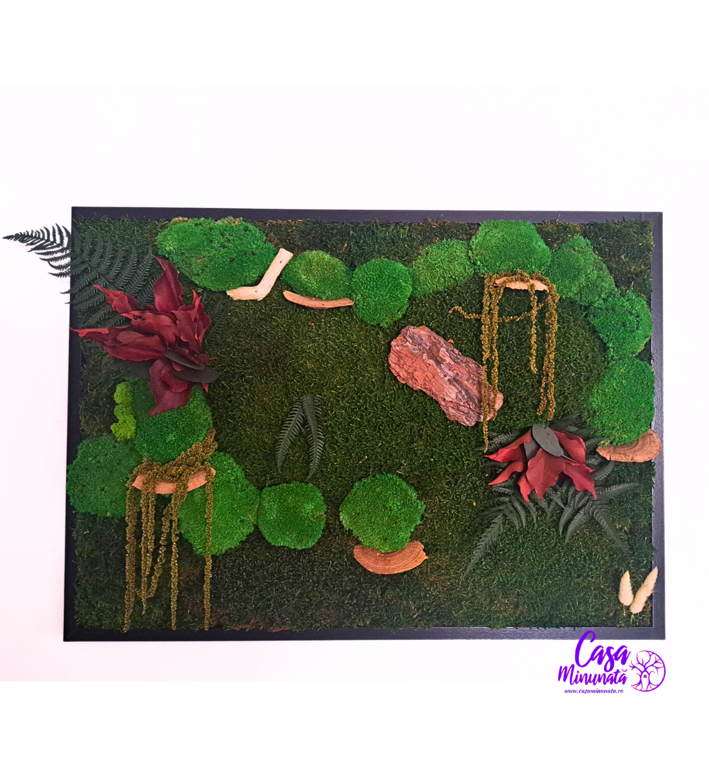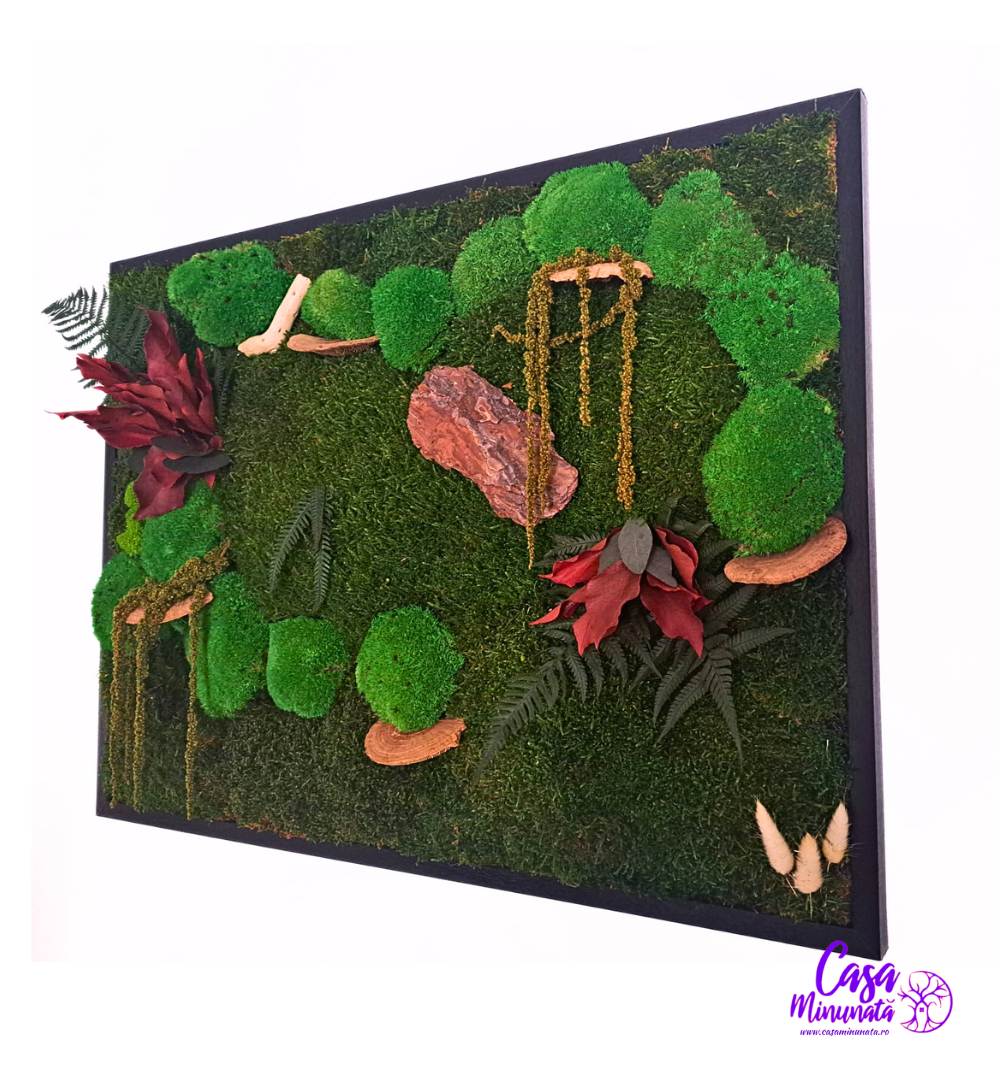 Adaugă natură în spațiul tău cu acest Tablou cu muschi naturali plati si bombati , realizat manual din mușchi plati și bombati. Îmbinat cu scoarță de copac, frunze decorative , acest tablou transformă orice perete într-o operă de artă eco.